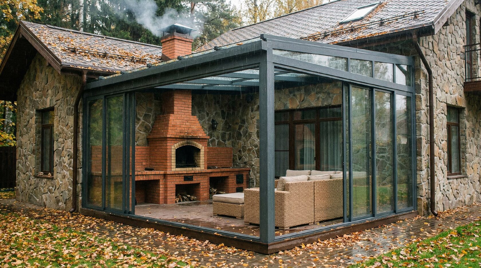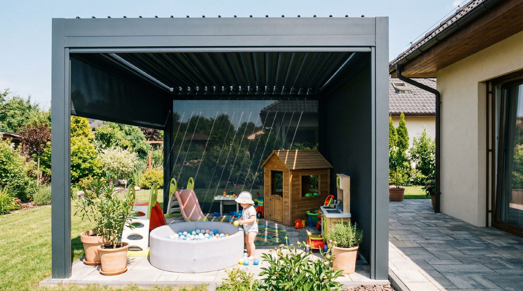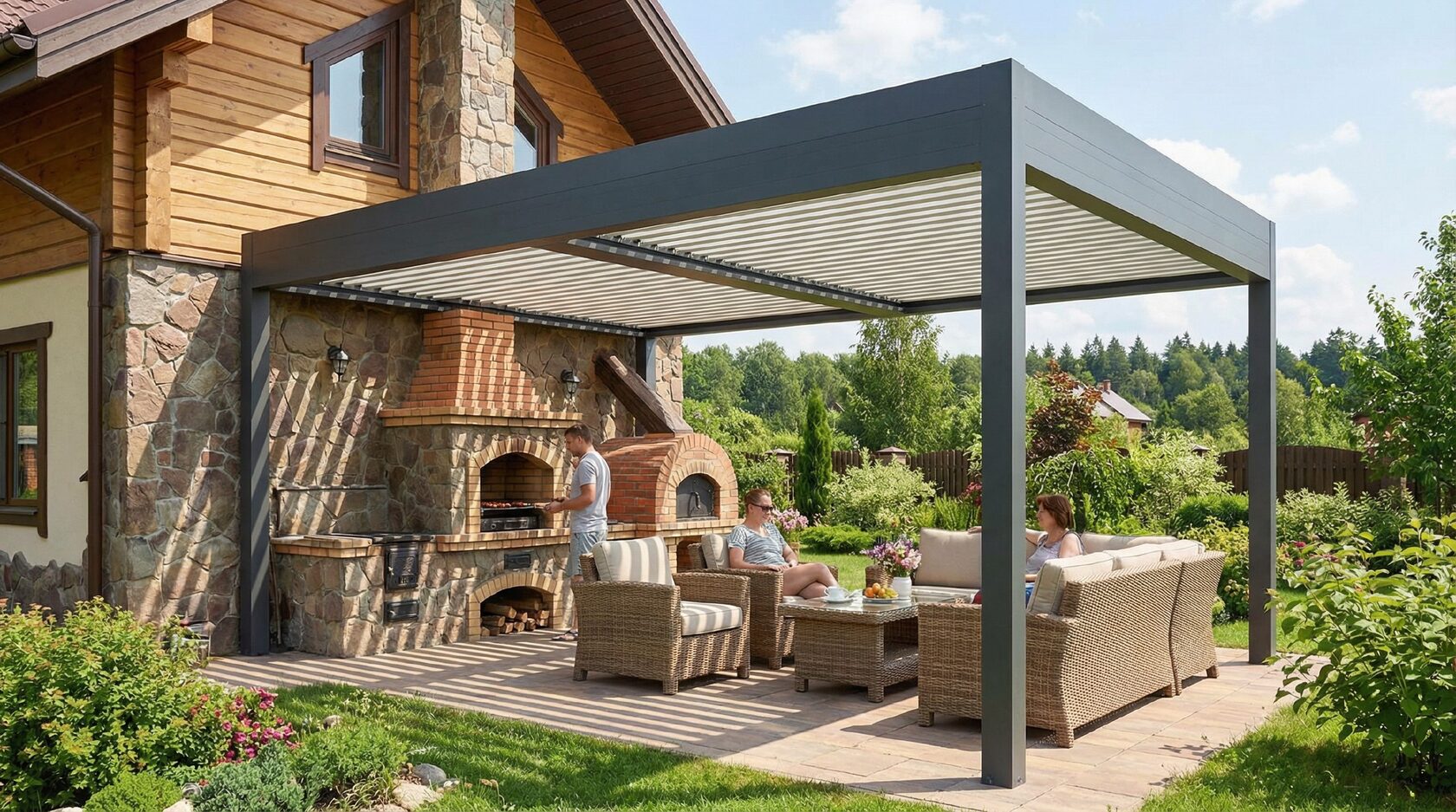 - Защита от дождя и ветра. Стационарные перголы и модели с тентами или интегрированным остеклением защищают мебель и технику, позволяют использовать зону при любой погоде.